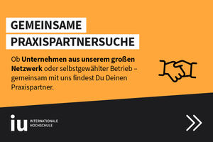 - 15.000+ Praxispartner: Bei der Suche nach dem passenden Betrieb unterstützt Dich die IU. Ob Praxispartner aus dem Netzwerk oder selbstgewähltes Unternehmen – du wirst zu jeder Zeit im Bewerbungsprozess begleitet.